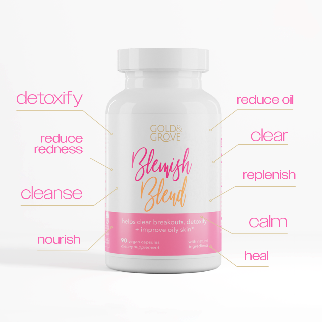 Blemish Blend is a daily multi vitamin specifically formulated for acne prone skin. It contains vitamins and antioxidants that work to help clear skin on an internal level by delivering the nutrients skin needs to be healthy and acne free. Utilizing our proprietary Skin Clearing Blend with Organic Ginger, Organic Turmeric, Oregon Grape Root and Grapefruit Seed Extract to help clear troubled skin of breakouts by detoxifying and improving oily skin that can clog pores.*Our product is made in the USA.
